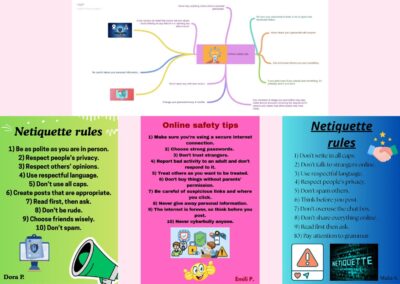 Učenici su također raspravljali o sigurnosti na internetu i kako se pristojno ponašati tijekom projekta i u digitalnom okruženju, pa su izradili plakate i umne mape u alatima Canva i Coggle u kojima su predstavili pravila za lijepo ponašanje (netiquette) i korisne savjete kako ostati sigurni u online okruženju.