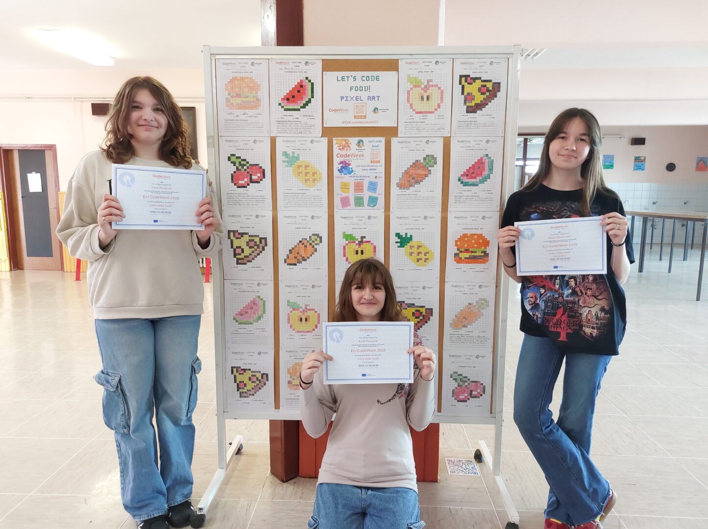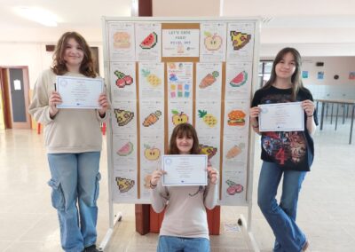 Kako bismo u listopadu obilježili Europski tjedan programiranja (EU Code Week) i Svjetski dan hrane (World Food Day), izradili smo zadatak unplugged kodiranja pod nazivom “Let’s code food!” i pozvali škole partnere, kao i škole diljem Europe, da nam se pridruže i izrade tzv. pixel art zadane hrane i istražite osnovne činjenice o njoj. Radove učenika možete pogledati na zajedničkoj Padlet stranici na ovoj poveznici: https://bit.ly/LetsCodeFood