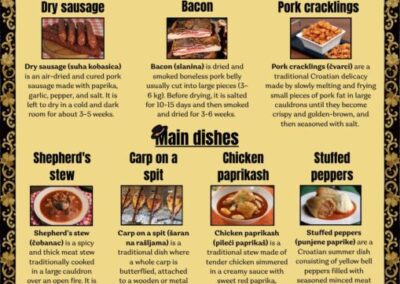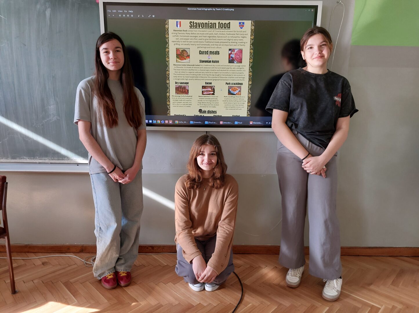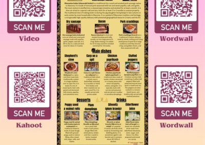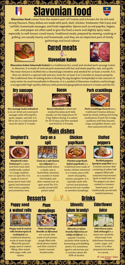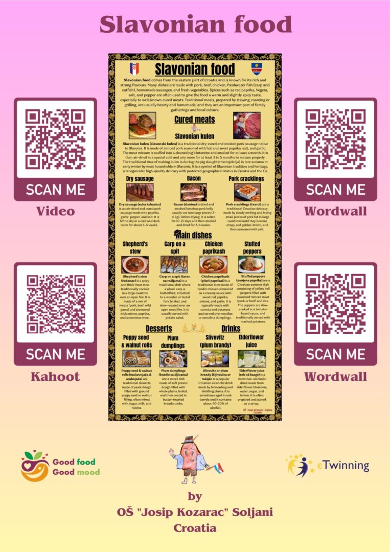 Kao dio eTwinning projekta “Good food, Good mood”, učenice 6. i 8. razreda koje pohađaju izvannastavnu aktivnost English Club, tijekom ožujka su imale zadatak u digitalnom obliku predstaviti neka od prepoznatljivih jela slavonske kuhinje. Učenice su predstavile neke od suhomesnatih proizvoda, a posebno su opisale proizvodnju kulena, koji je ujedno i maskota našeg tima u projektu. Od glavnih jela učenice su odabrale prezentirati čobanac, pileći paprikaš, punjenje paprike i šarana na rašljama. Za desert su odabrale tradicionalne knedle sa šljivama, makovnjaču i orahnjaču, a od piće su ukratko predstavile šljivovicu i sok od bazge. Slavonsku hranu predstavljenu u obliku infografike izrađene u Canvi možete pogledati u prilogu, a video uradak na ovoj poveznici:https://bit.ly/SlavonianFoodVideo. Učenice su izradile i Kahoot kviz o slavonskoj hrani za ostale učenike u projektu, kao i digitalne aktivnosti u alatu Wordwall.