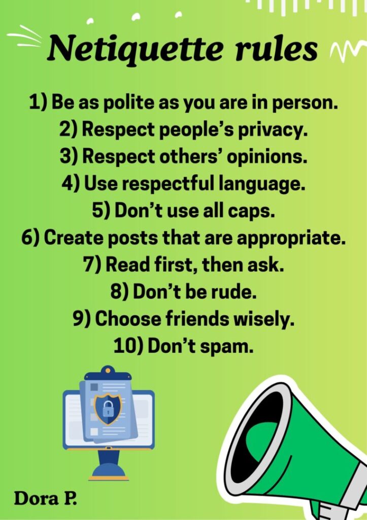Dan sigurnijeg interneta u sklopu eTwinning projekta „Good food, Good mood” obilježile su i učenice 6. i 8. razreda koje pohađaju izvannastavnu aktivnost English Club. Učenice su prvo raspravljale o sigurnosti na internetu i kako se pristojno ponašati tijekom projekta u digitalnom okruženju te su izradili plakate i umne mape u alatima Coggle i Canva u kojima su predstavile pravila za lijepo ponašanje (netiquette) i korisne savjete kako ostati sigurni u online okruženju.