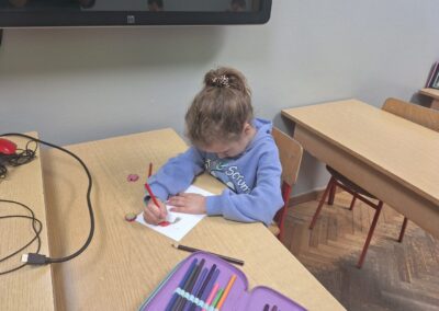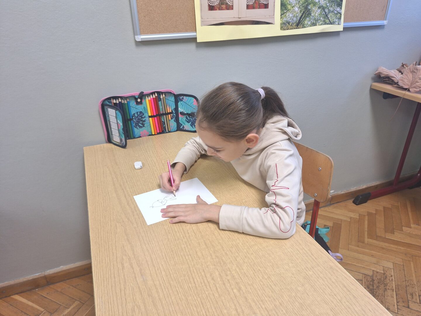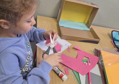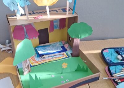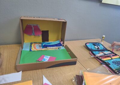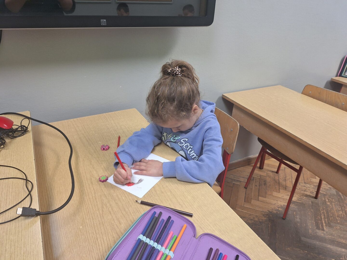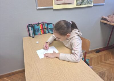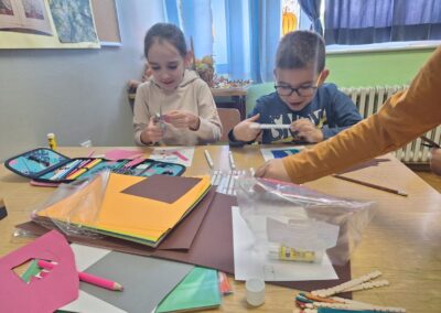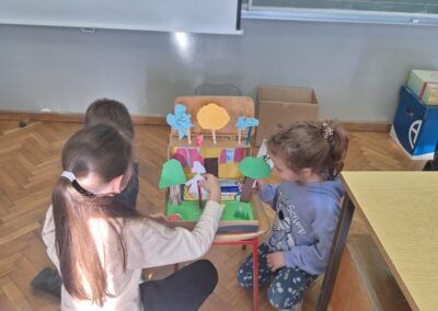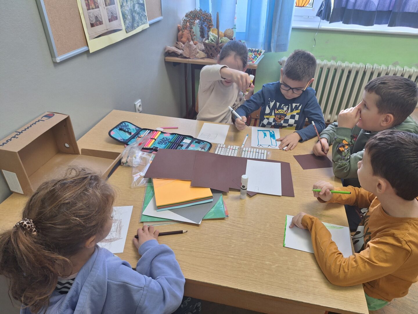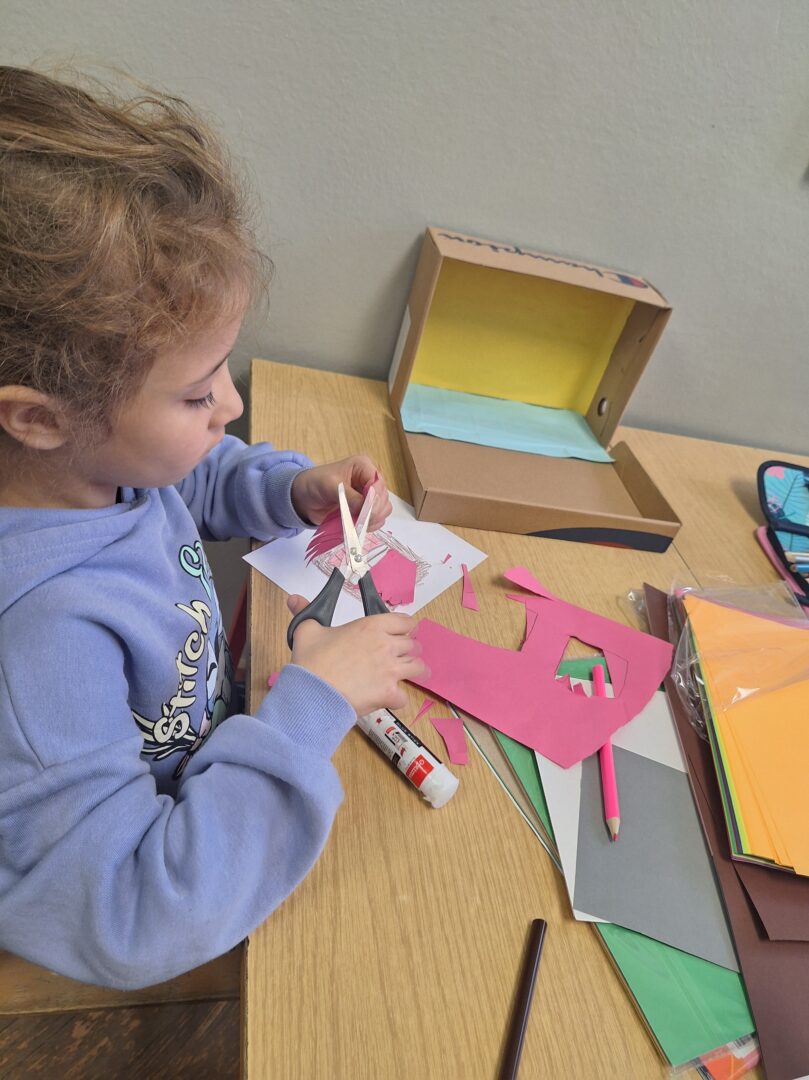 Nakon razgovora uslijedio je najkreativniji dio radionice, izrada vlastitog kazališta u kutiji. Učenici su izrađivali likove i scenografiju iz bajke. Uz mnogo entuzijazma, suradnje i maštovitosti, te uz pomoć šarenog papira, kartona, škara i ljepila, nastala su prava mala umjetnička djela. Svaki učenik dao je svoj doprinos izrađujući likove Crvenkapice, bake, lovca i vuka, kao i šumu i bakinu kućicu.