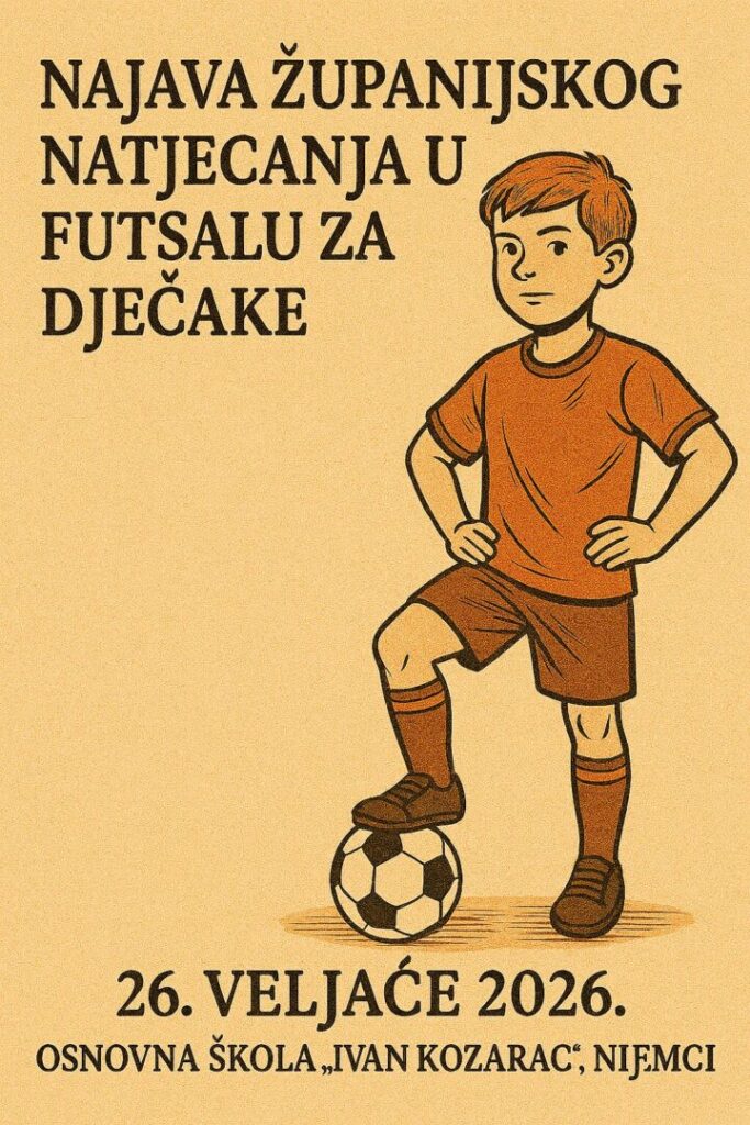 Dječaci naše škole pod vodstvom učitelja Antuna Maršalka nastupit će na Županijskom natjecanju u futsalu, koje će se održati 26. veljače 2026. godine u Osnovnoj školi “Ivan Kozarac” u Nijemcima.